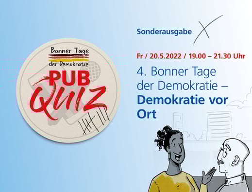 Antworten auf diese und weitere Fragen suchen, diskutieren und finden wir zusammen mit euch bei unserem Pubquiz in der Pauke am 20. Mai! Unter dem Motto „Demokratie vor Ort“ testen unsere Quizmaster euer Wissen bei der vierten Ausgabe der Bonner Tage der Demokratie. Entdeckt gemeinsam mit uns, welche Stärken die Demokratie hat – und wo sie unsere ständige Unterstützung braucht.